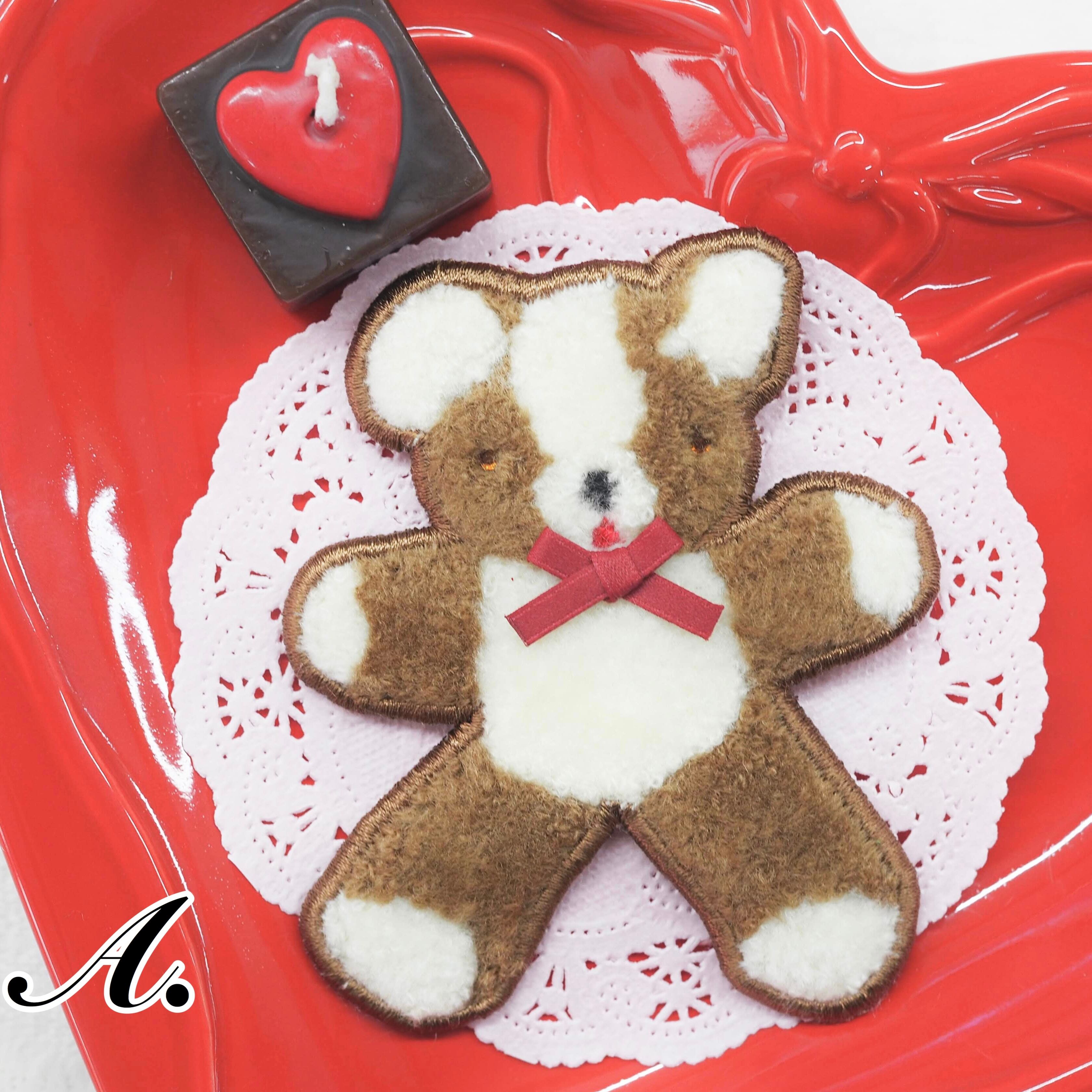 リボンをキュッと結んだおめかし姿が可愛いクマのワッペンブローチです。